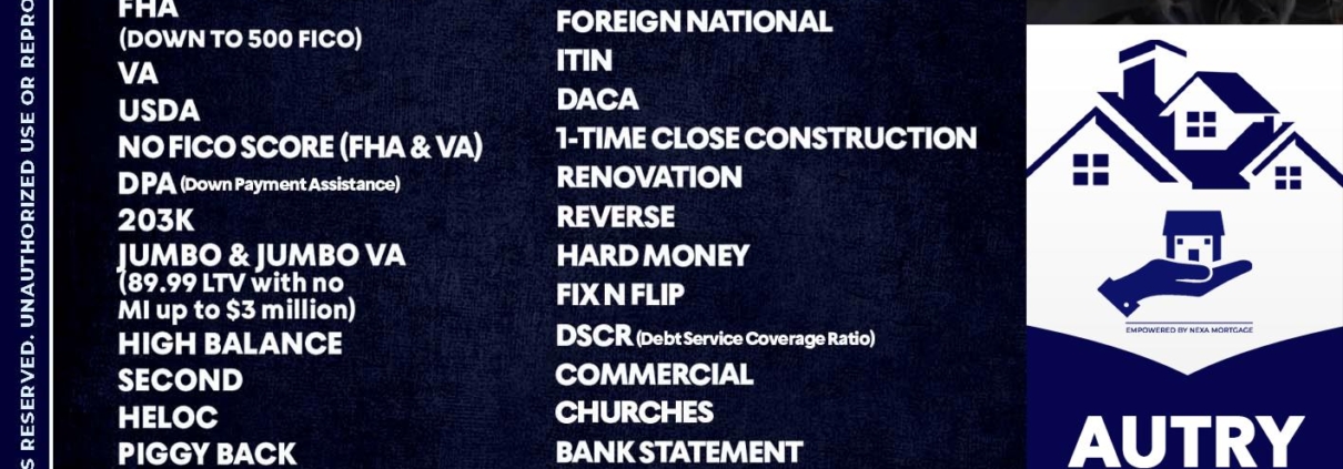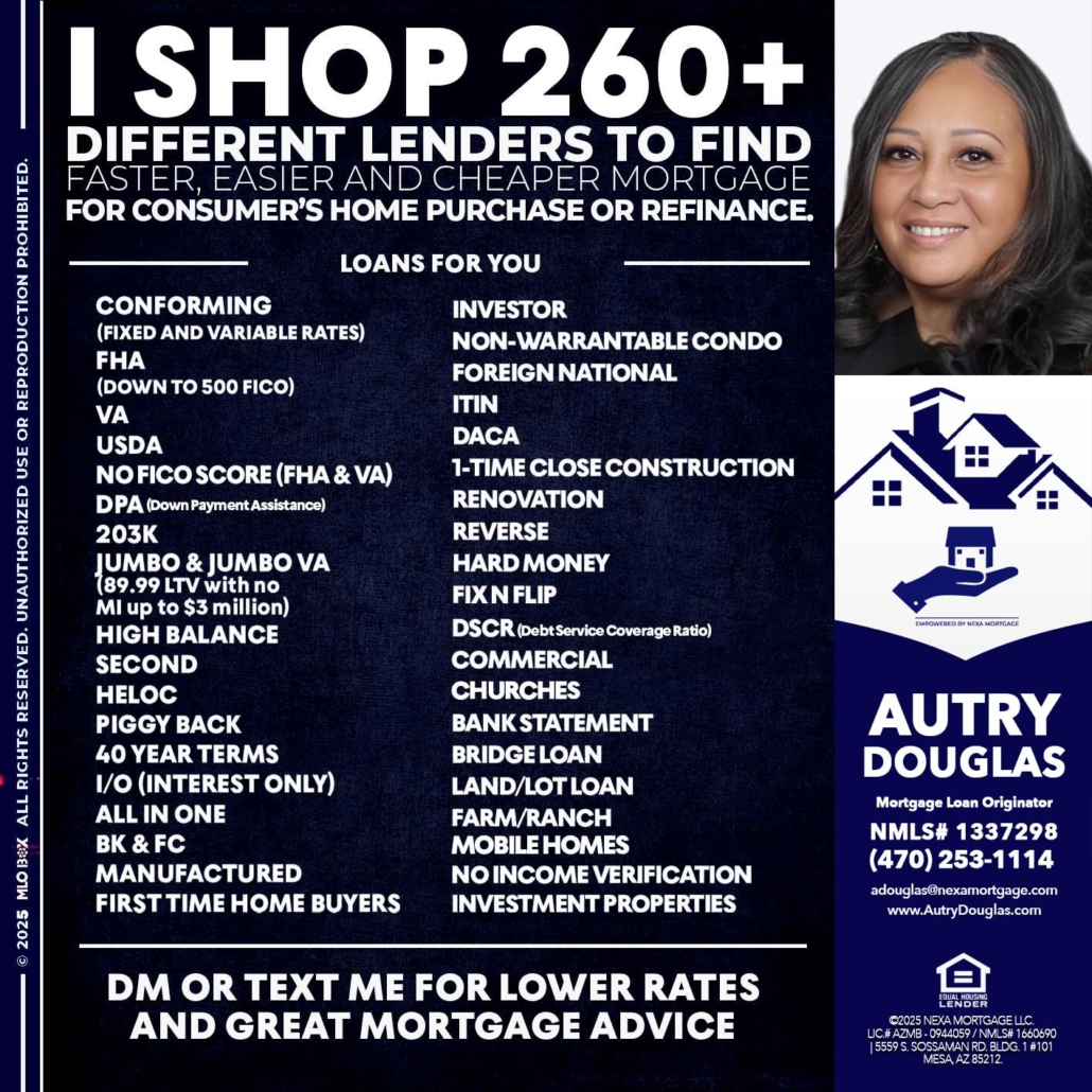 Hi, my name is Autry Douglas. I’m a Loan Officer with NEXA Mortgage LLC., offering personalized mortgage solutions, fast customized quotes, great rates and service with integrity.